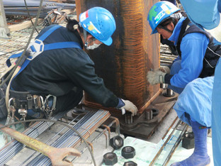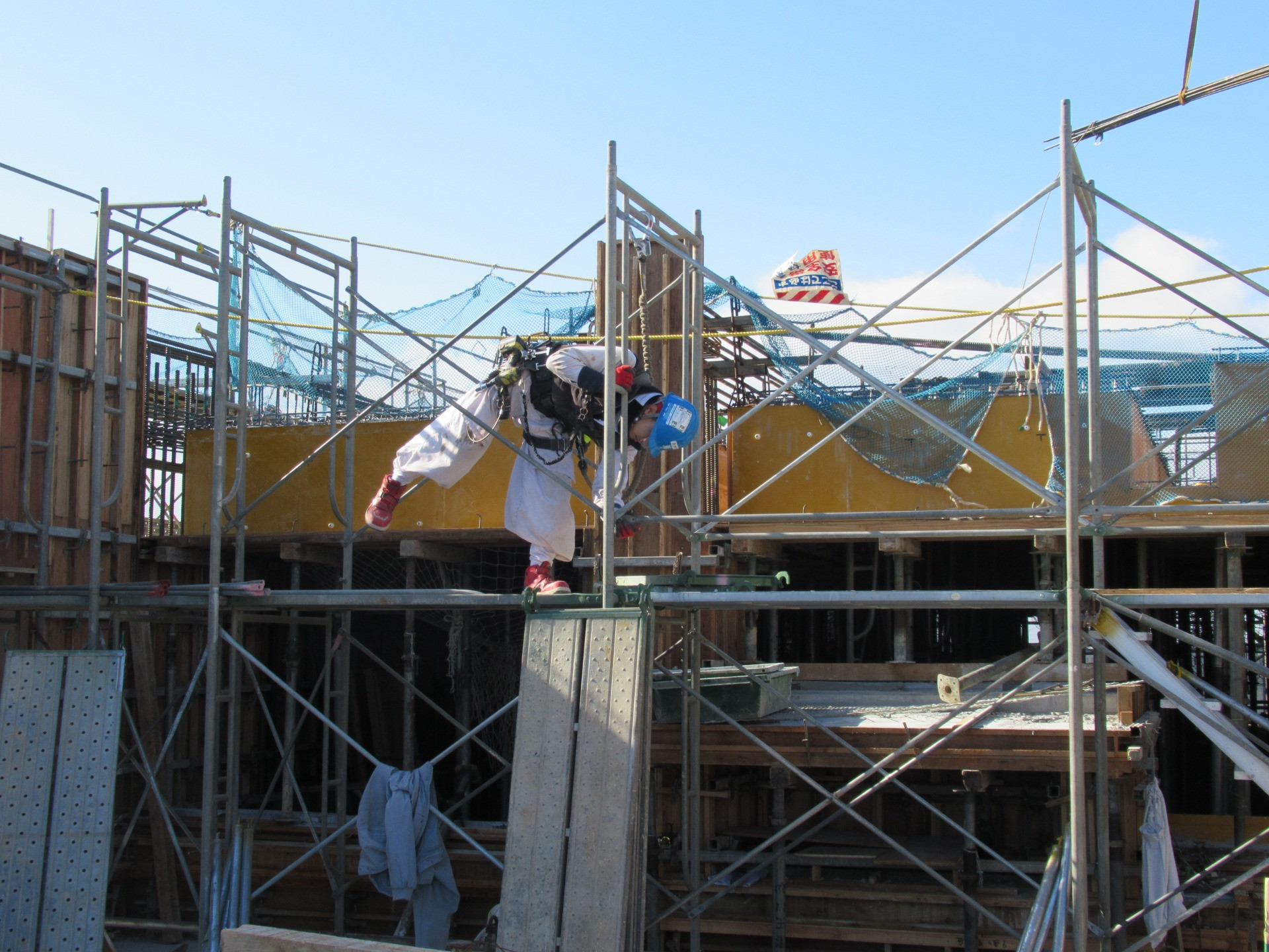 また職業柄、高所での作業が多いため安全面へは最大限の配慮を払っており、鳶土工ともハーネスの着用を義務付けており安全帯も必ずフックを二重に掛けることを徹底し、万が一の落下などの事故が発生しないよう配慮しております。定期的に安全集会を実施し、協力会社と共に現況報告や今後の予定、災害事例などを周知・伝達するのも取り組みの一つです。